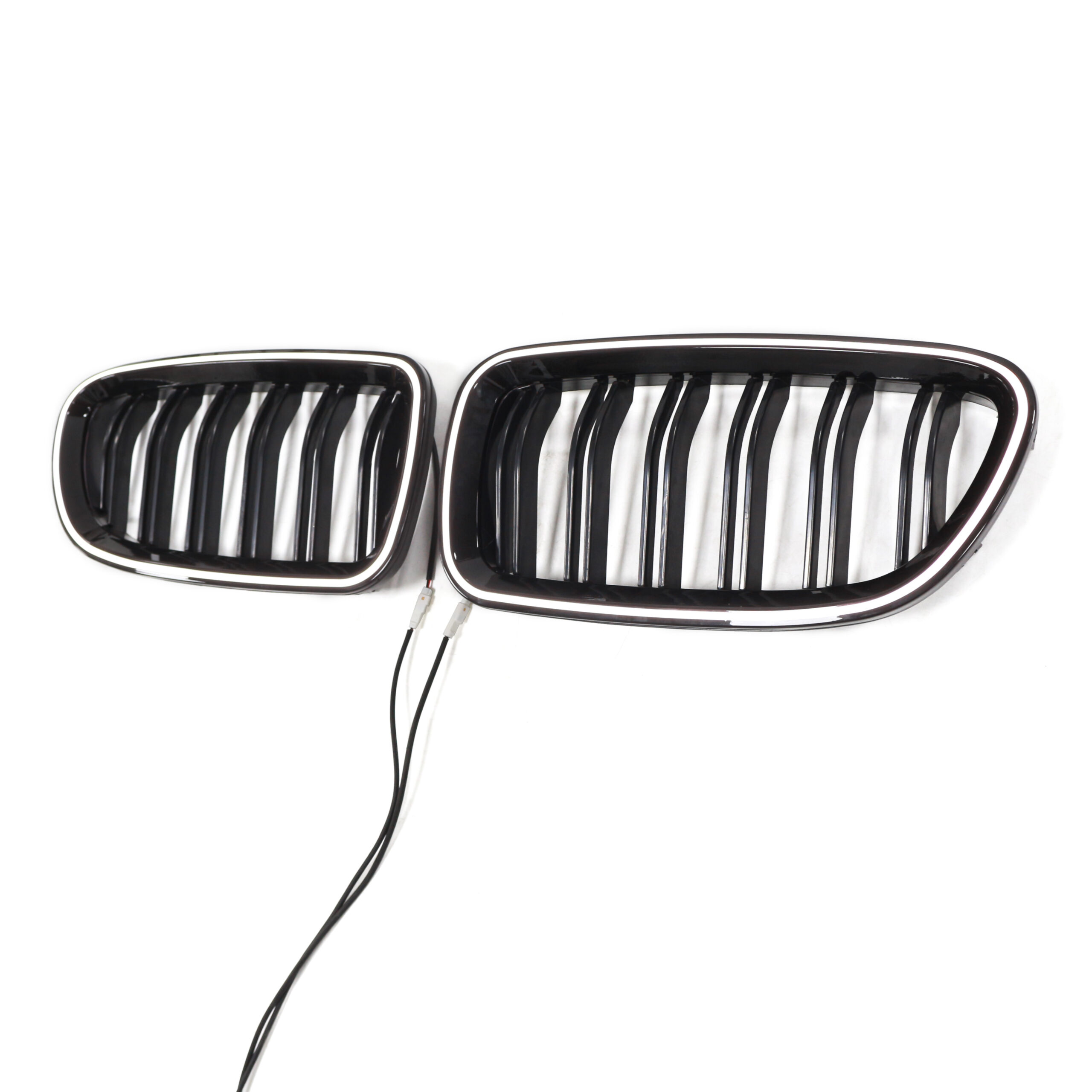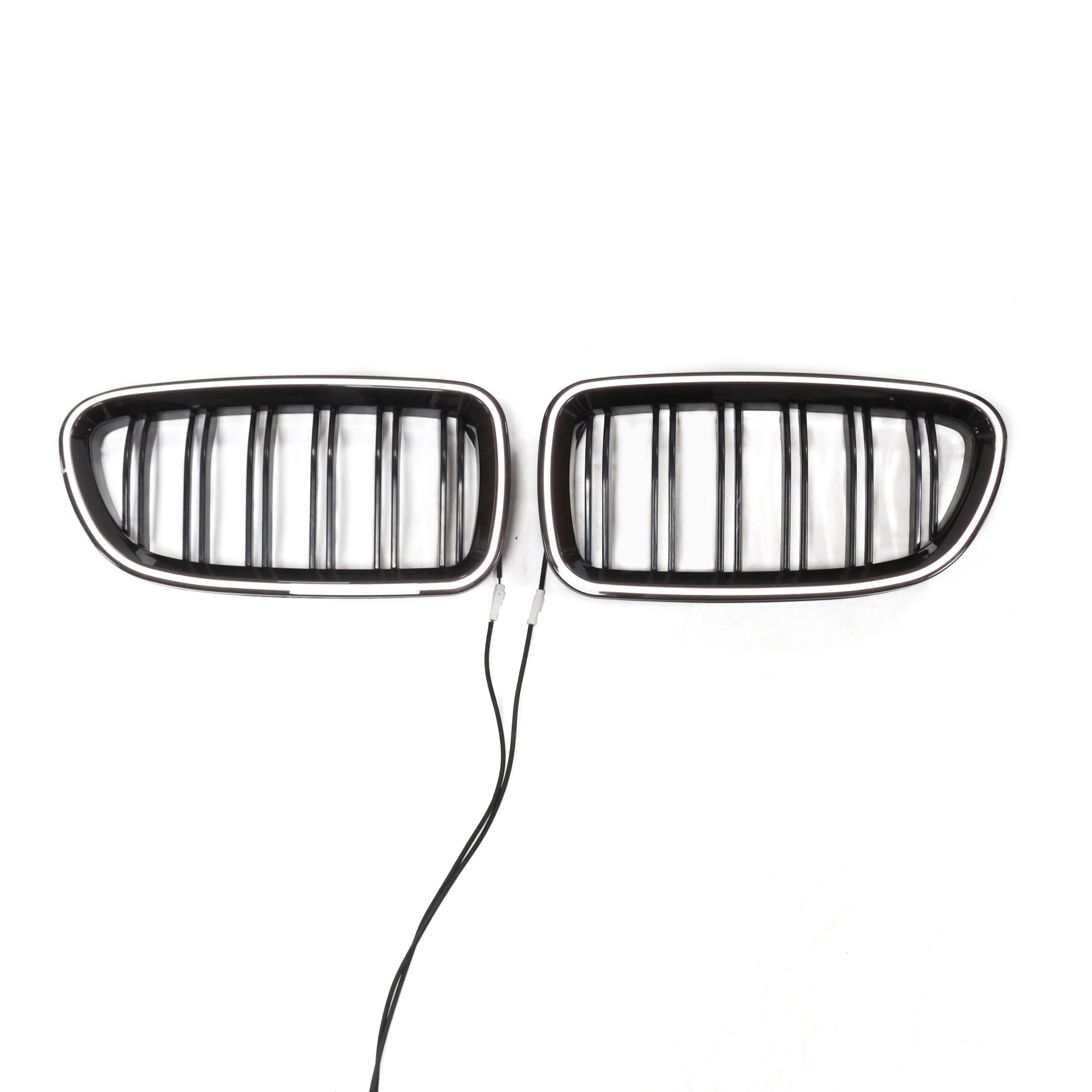 Juodos, blizgios BMW F10 F11 priekinio buferio dvigubos grotelės su LED apšvietimu.